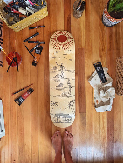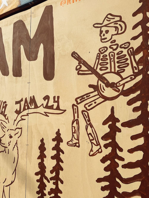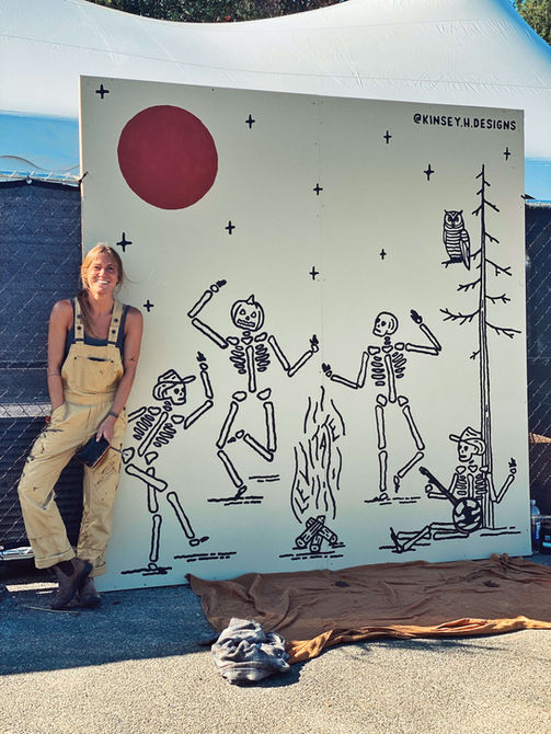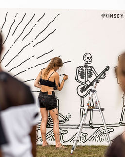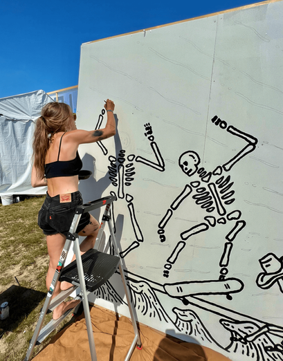 An honor to paint all three days, during this absolutely epic festival! Amazing music, artist and people! This year the canvas size was 20x8 feet, and as one of 10 muralist at this festival, we had creative freedom. This piece I did put together all of my favorite skeletons in a surf setting, all vibing out in their own way with dancing, placing music, doing some yoga, and chilling out.