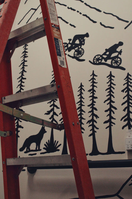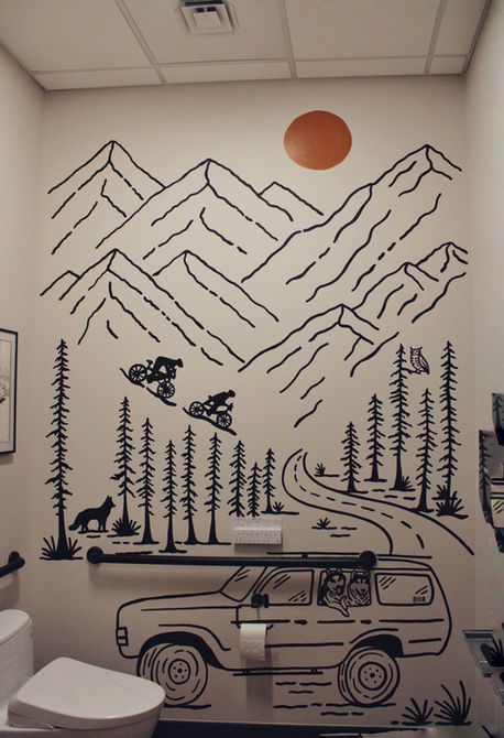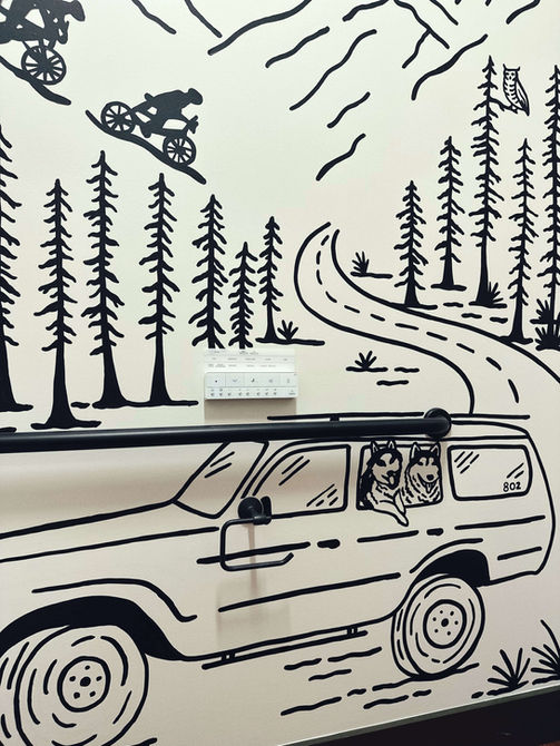 3 walls in total, we worked on the primary wall in the workshop, and two bathroom walls. The shop wall was positive vibes inspired, and the bathrooms were Costa Rica themed, and Vermont themed. Even got the owners two pups in the jeep :)